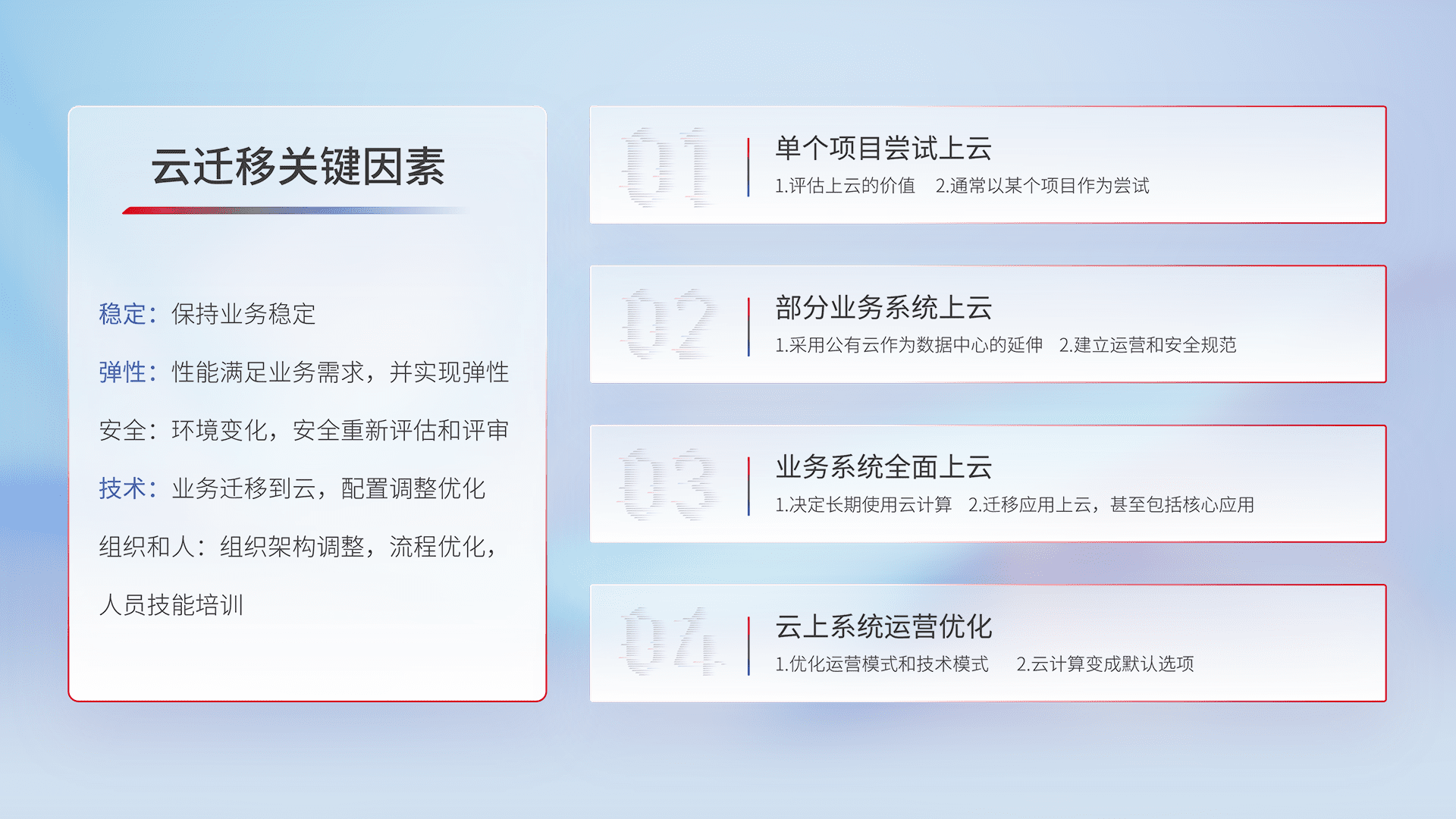 结合实际业务,,,从规划设计、、、云平台选型、、、云原生改造、、数据迁移、、、、集成交付,,,,迁移全过程为客户识别最佳上云路径,,做好风险识别管理,,,,设计网络架构、、身份权限、、安全审计合规、、、操作审计、、、日志审计、、、、监控告警策略、、、多站点容灾设计等,,对云上基础设施进行整体规划,,提升IT治理水平,,,以满足弹性、、、高可用、、高性能的需求。。。