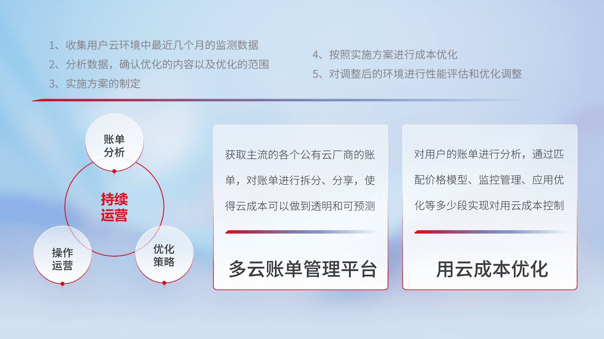 通过多云纳管,,,以统一的资源数据模型把客户的云资源进行抽象和封装,,进而实现对多云资源的统一操作,,,保障云资源管理的可靠性、、稳定性与可用性。。量身定制化运维内容,,,,配置、、、、开发运维、、补丁管理、、、备份、、监控、、认证和访问管理、、审计和日常巡检等,,,,保障在用云过程中的可靠度,,,,稳定度以及高可用率。。